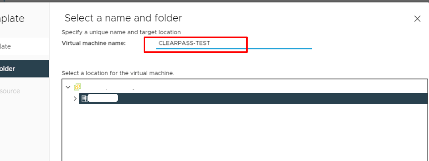 Bizden sunucuyu kurmak istediğimiz lokasyonunu seçmemizi ve kuracağımız sanal makinemize bir isim vermemizi istiyor. İsim olarak “CLEARPASS-TEST” ismini veriyorum ve “Next” butonuna basıp devam ediyorum.
