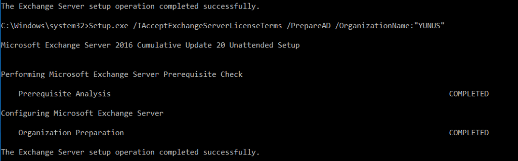 Setup.exe /IAcceptExchangeServerLicenseTerms_DiagnosticDataON /PrepareAD /OrganizationName:"YUNUS"