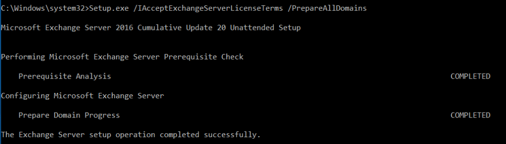 Setup.exe /IAcceptExchangeServerLicenseTerms_DiagnosticDataON /PrepareAllDomains