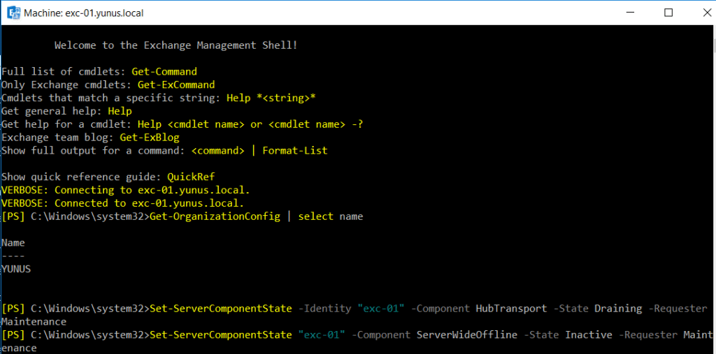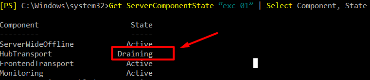 Set-ServerComponentState -Identity “Exc-01” -Component HubTransport -State Draining -Requester Maintenance