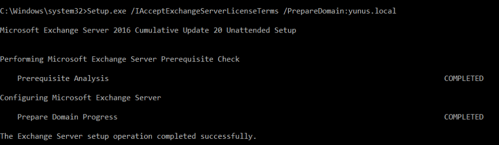Setup.exe /IAcceptExchangeServerLicenseTerms_DiagnosticDataON /PrepareDomain:yunus.local