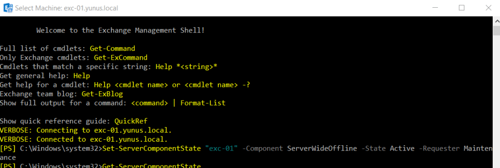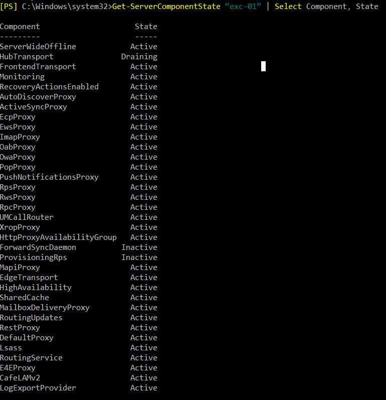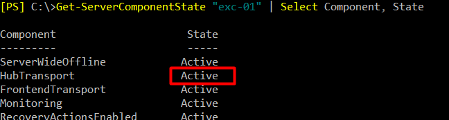 Set-ServerComponentState "exc-01" -component HubTransport -state Active -Requester Maintenance