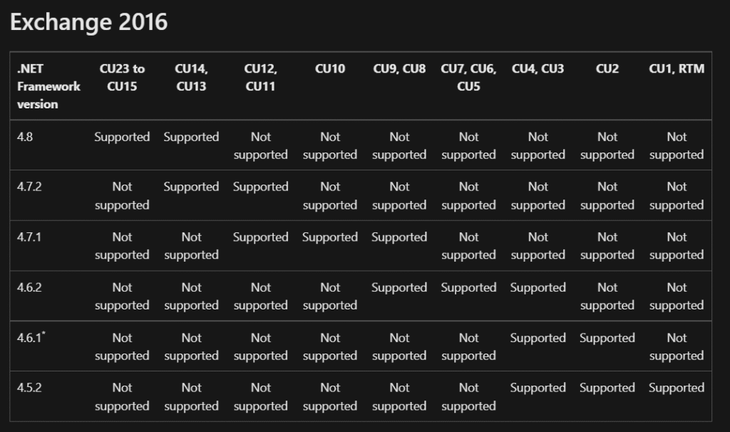 Öncelikle Windows update i çalıştırıp tüm windows updateleri alalım. Daha sonra .NET güncellemelerini de alalım. Olmazsa elle yükleyelim. Aşağıdaki Exchange CU .NET framework matrix tablosundan versiyon bilgisine bakabiliriz.