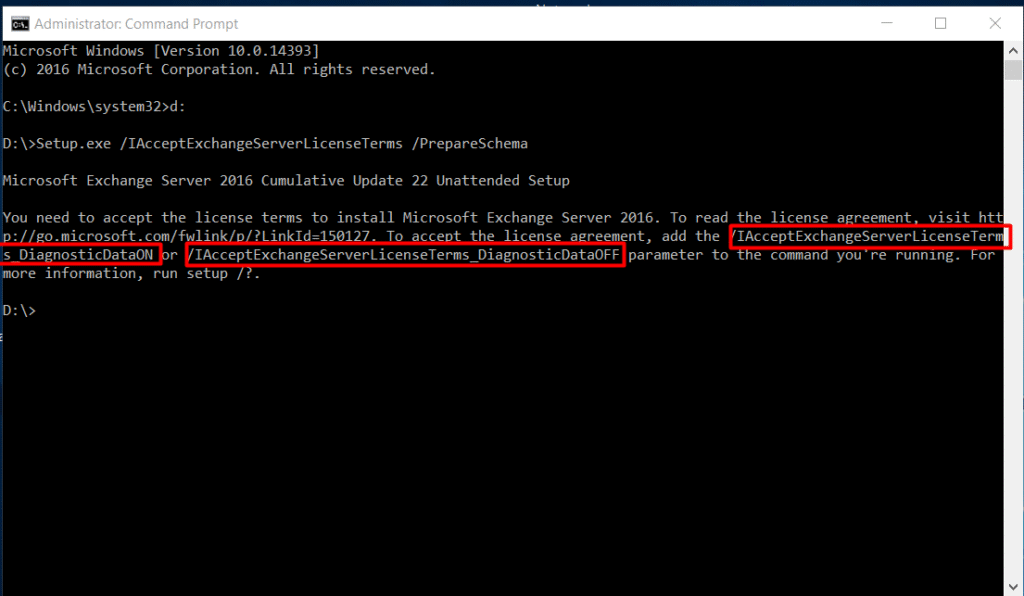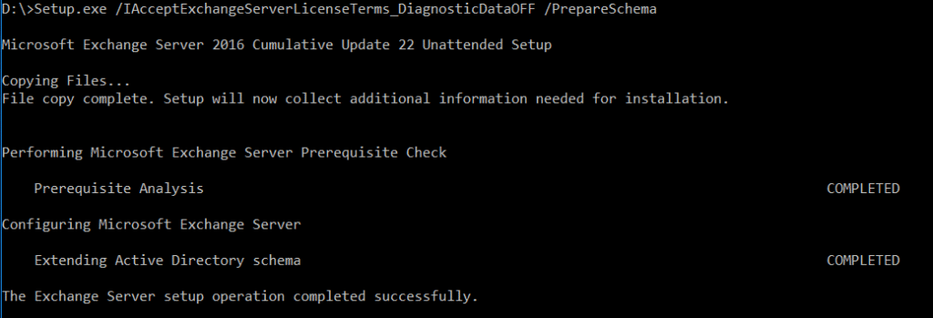 Setup.exe /IAcceptExchangeServerLicenseTerms_DiagnosticDataON /PrepareSchema
