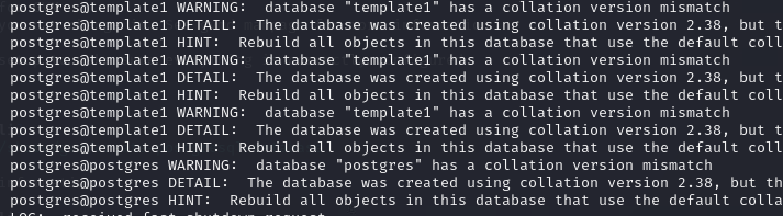 HINT: Rebuild all objects in this database that use the default collation and run ALTER DATABASE gvmd REFRESH COLLATION VERSION, or build PostgreSQL with the right library version.