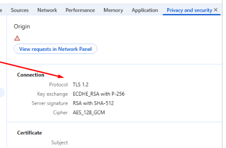Chrome → DevTools → Security sekmesi → TLS 1.2 görmemiz gerekiyor.