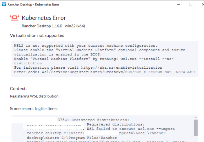 Rancher Desktop u açarken aşağıdaki hatayı alabilirsiniz. WSL Virtual desteği açık olmadığı için algılayamıyor.