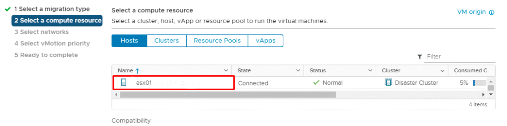 Next dedikten sonra bu sefer bizden sanal makinenin bulunduğu hosttan hangi hosta aktarmak istediğimizi soruyor. Bu ekranda kaynakları en rahat host seçiyor ve ilerliyoruz.