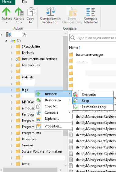 Geri getirmek istediğimiz bir klasörü sağ tıklayıp “Restore” seçeneğinde “Keep” i seçerek mevcut bulunan dosyanın yanına farklı bir dosya ismi ile geri getirmektedir.
