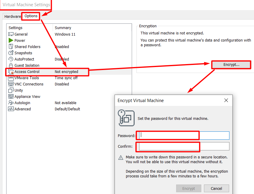 Ayarlara girdikten sonra “Options” tabına geçip “Access Control” ayarlarına gelip sanal makinemizi şifreliyoruz.