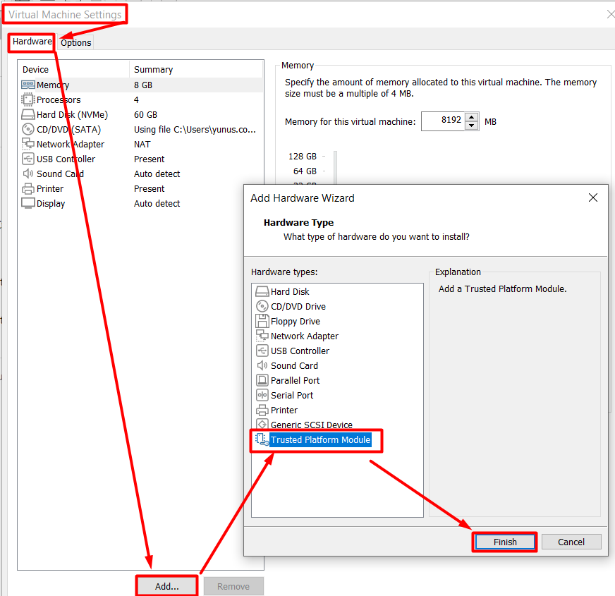 Daha sonra “Hardware” tabına gelerek burada sanal makinemize TPM modülü ekliyoruz. Bir önceki adımdaki “Encrypt” işlemini yapmadan TPM aygıtı eklenemiyor.