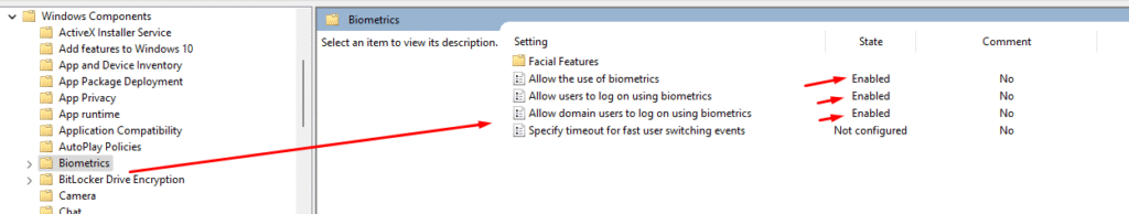 Computer Configuration > Administrative Templates > Windows Components > Biometrics > Allow the use of biometrics