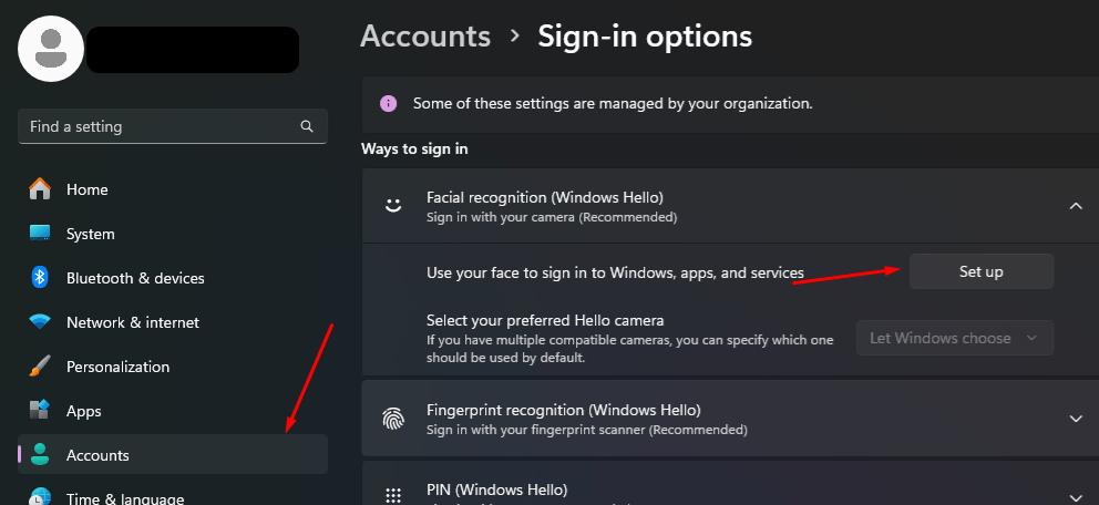Setup a tıkladıktan sonra yüz tanıma kaydı yapacak. Eğer bilgisayarınız domainde ise kullanıcı şifrenizi isteyecek ardından PIN tanımlaması yapmanızı isteyecektir.