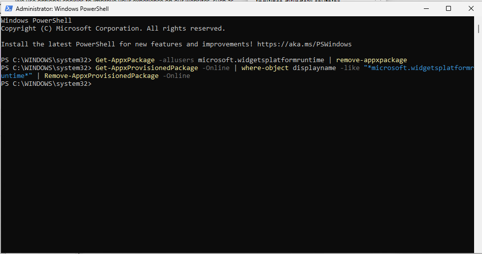 Get-AppxPackage -AllUsers Microsoft.WidgetsPlatformRuntime | Remove-AppxPackage