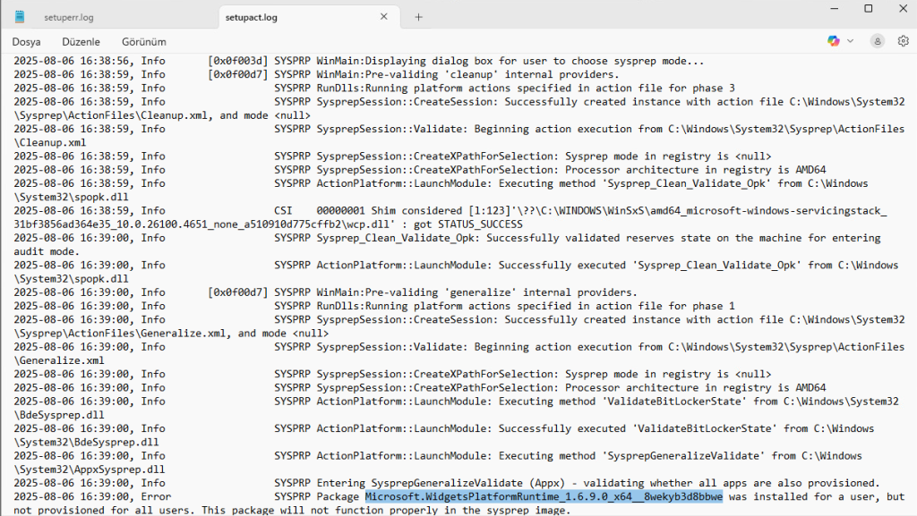 İlgili hata logları sysprep dosyası içerisinde bulunan “setupact.log” dosyasında mevcut.