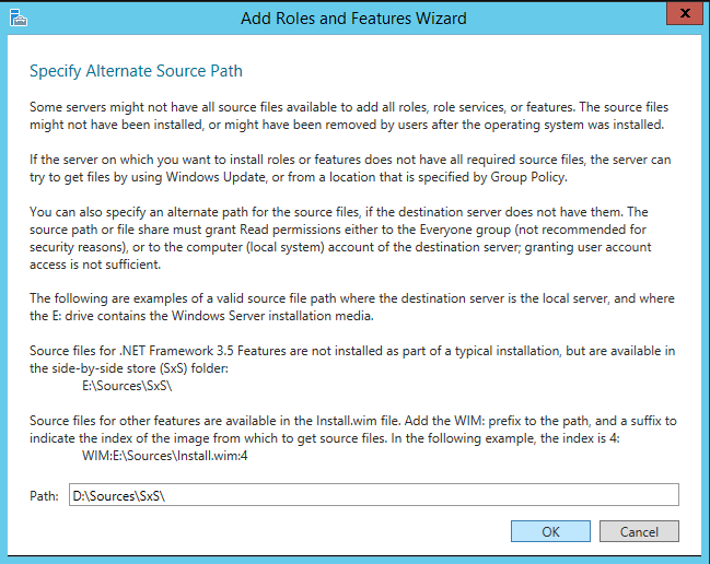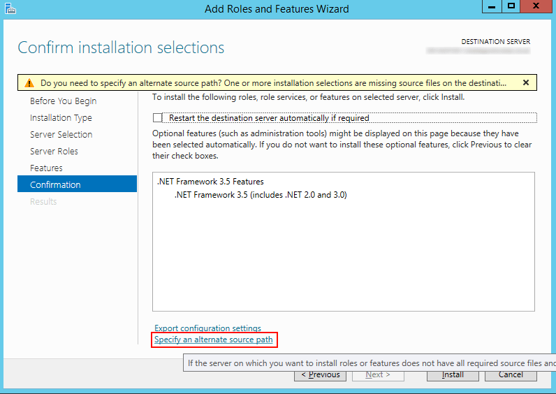 Add roles and features dan son yükleme adımına geldiğimizde altta bulunan “Specify an alternate source path” e tıklıyoruz.