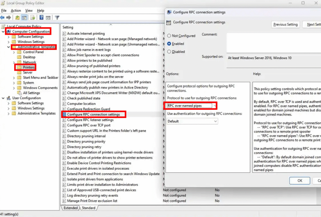 Açılan ekranda gpedit.msc ekranında sol tarafta Administrative Templates > Printers > Configure RPC connection settings isimli policy e ulaşıyoruz. Policy i açtıktan sonra öncelikle Etkin ve “Enable” konuma getiriyoruz. Görüyoruz ki ek ayarlar aktif oluyor.